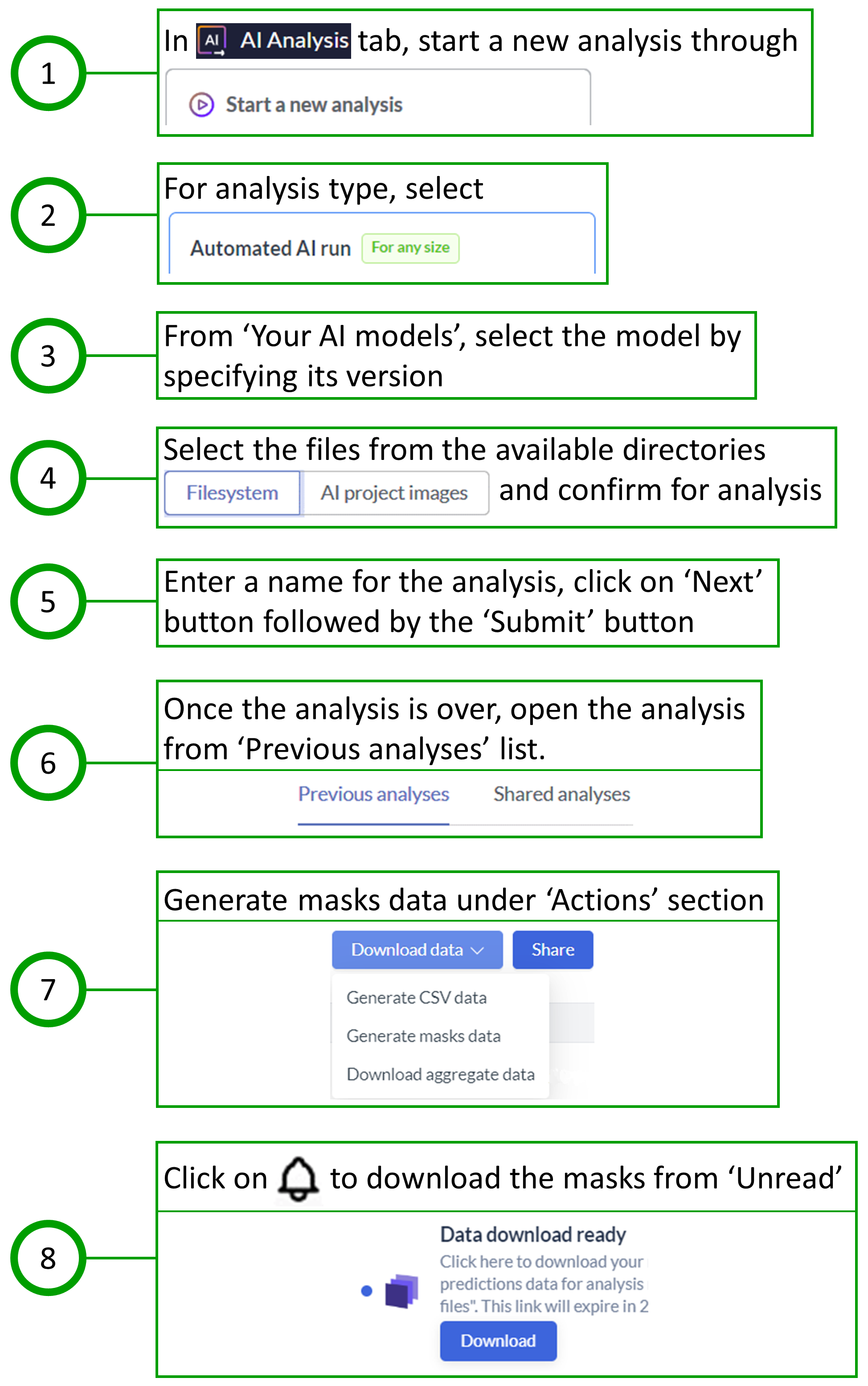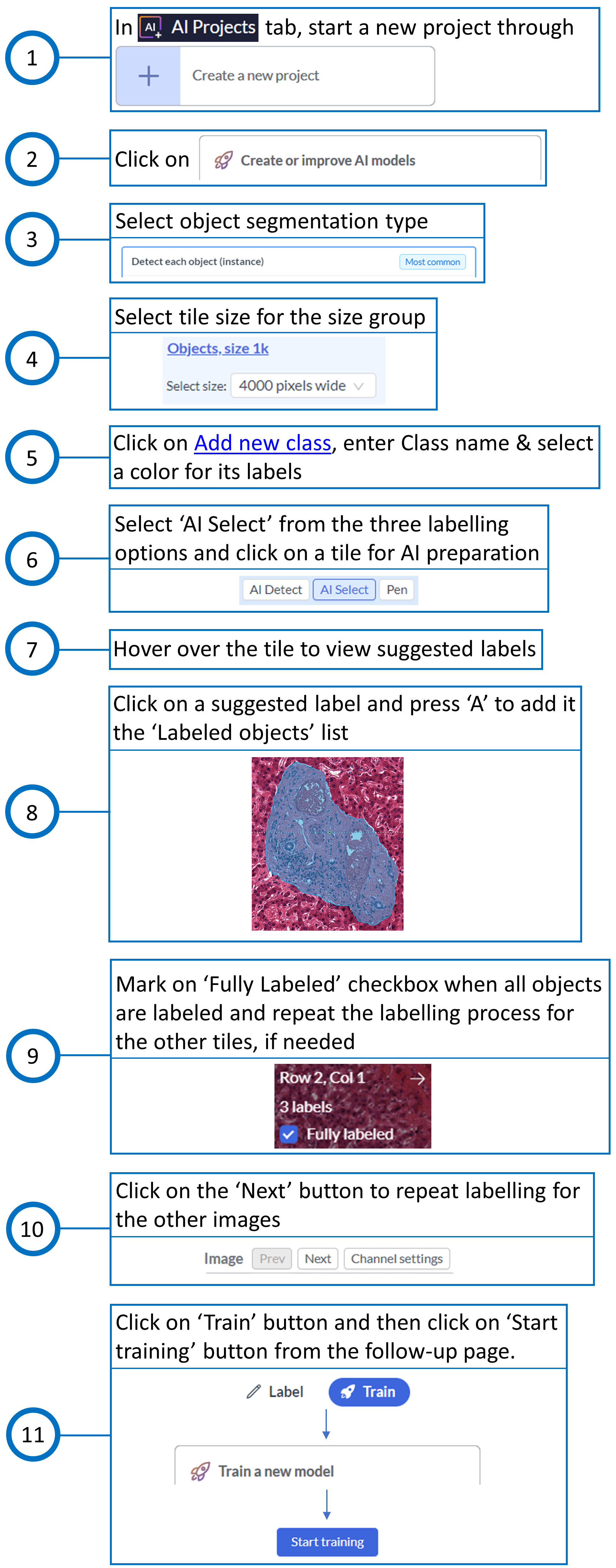 Since the nuclei within each portal tract also needed to be obtained, the workflow was initiated by performing the analysis on Biodock first, followed by downloading the portal tract masks for further analysis in QuPath. The steps taken for training and testing in Biodock are shown in Fig. 3 and Fig. 4, respectively.