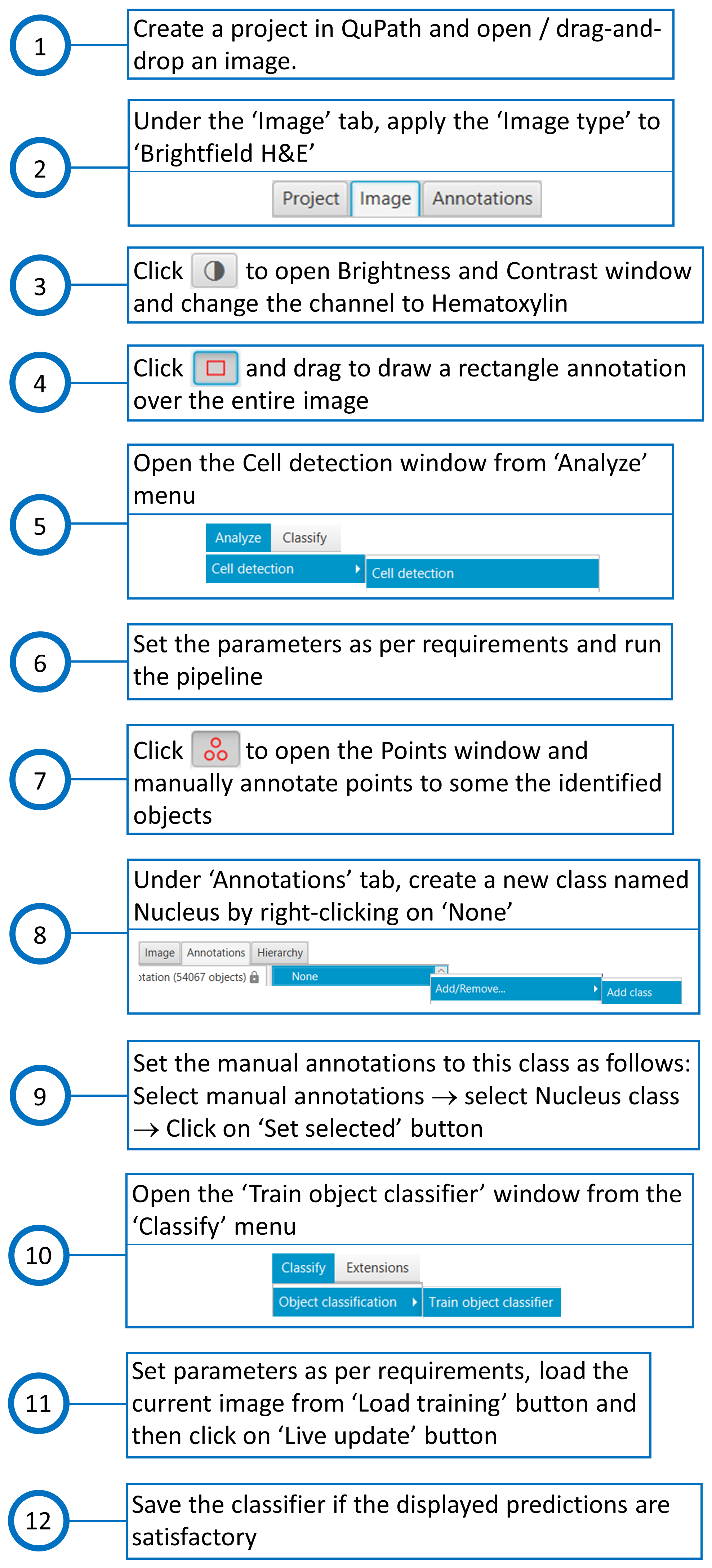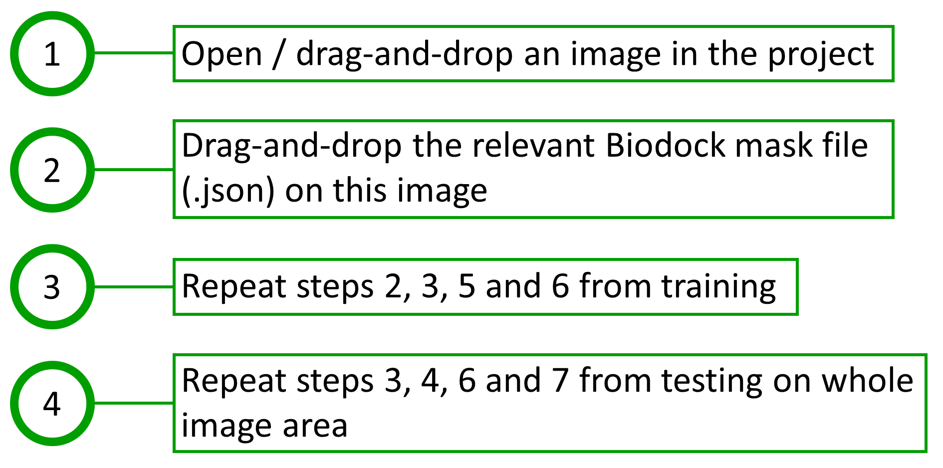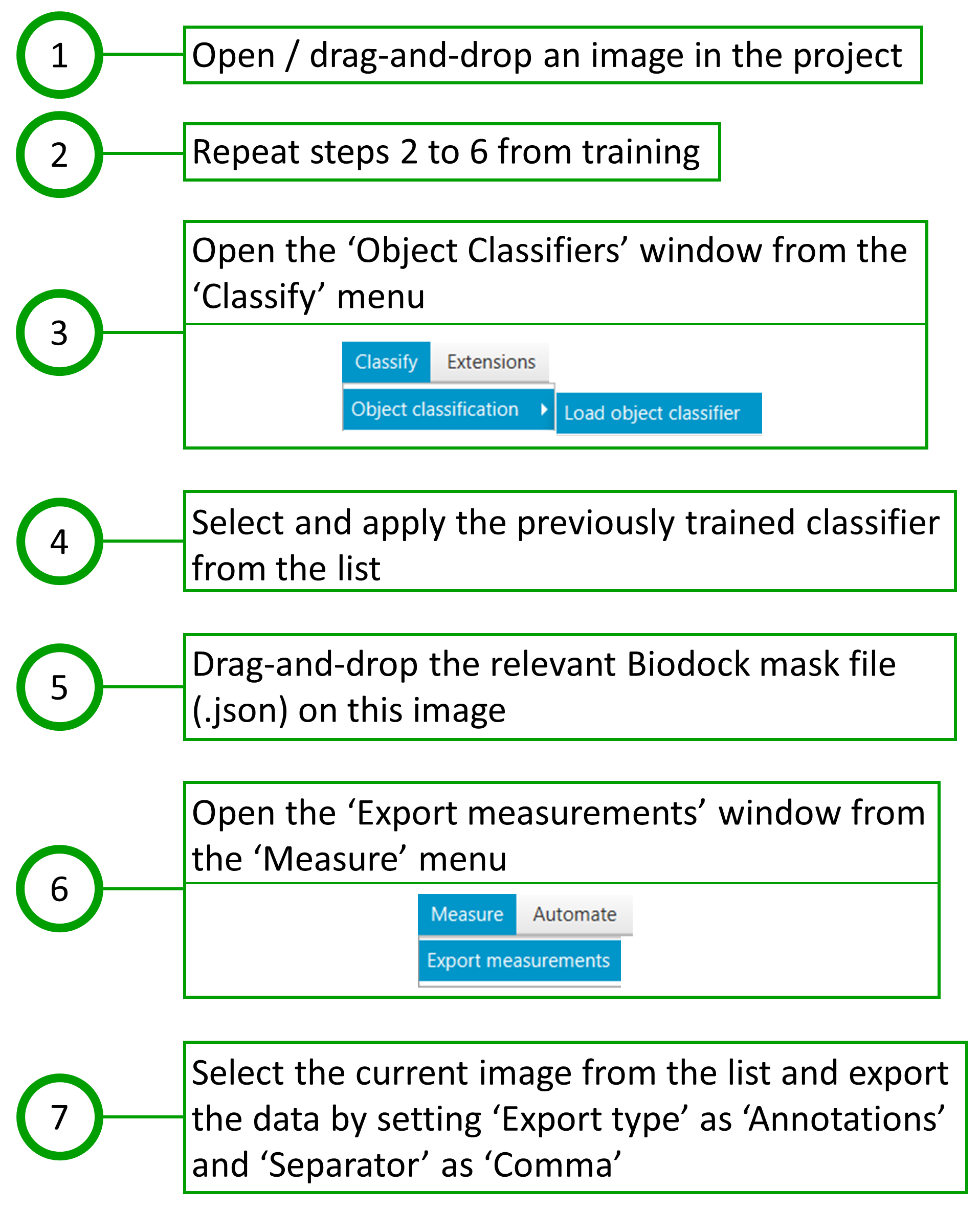 The steps taken for training in QuPath are shown in Fig. 5. The procedure for testing in QuPath was divided into two segments: one that identifies nuclei in the whole image area, and the other that identifies nuclei within the boundaries of Biodock masks, i.e., within each portal tract polygon. The steps taken for testing in QuPath are shown in Fig. 6 and Fig. 7. The measurements, when finally exported from QuPath, consist of a merged report on portal tracts and nuclei.