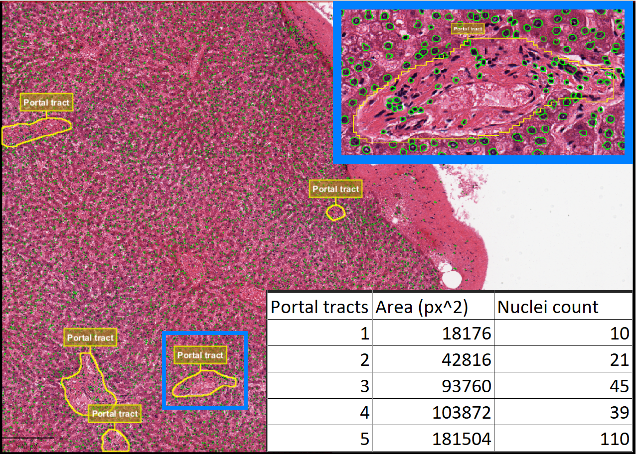 The expectation from the analyses were the identification of nuclei, portal tracts, and the nuclei within each portal tracts in the liver tissue.