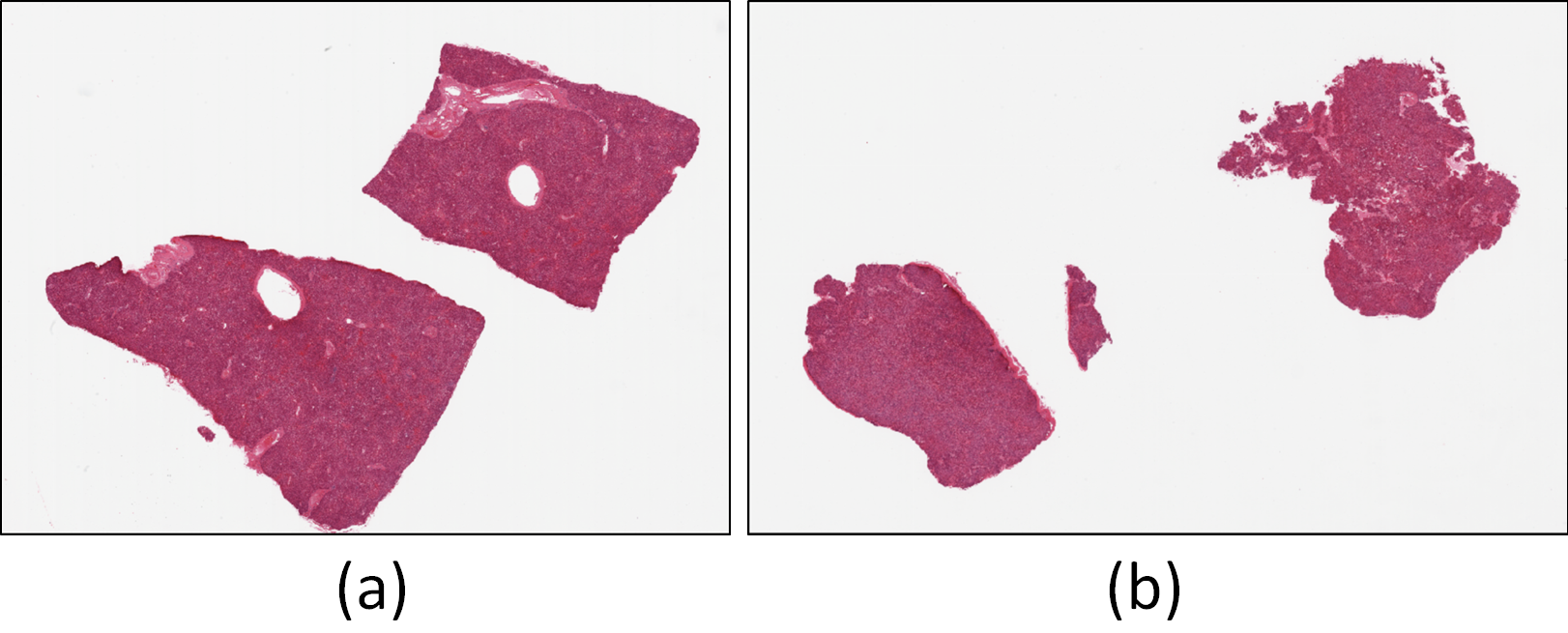 The data for this experiment was sourced from the GTEx portal (https://gtexportal.org/home/histologyPage), a well-established resource for histological and genetic data. Two whole slide images of H&E stained liver tissues, corresponding to the sample IDs GTEX-11GSP-0626 (Fig. 1(a)) and GTEX-11NUK-1226 (Fig. 1(b)), were selected for use in both training and testing machine learning models within QuPath and Biodock. Processing whole slide images, however, is highly demanding. Not only does it require a system with significant computational resources, but the time needed to analyze and process the images can also be quite substantial. To mitigate this challenge, and to improve efficiency without compromising the quality of the data, twelve smaller sections were carefully extracted from the whole slide images. Specifically, seven sections were taken from GTEX-11GSP-0626 and five from GTEX-11NUK-1226. Each section was extracted with a resolution of 6000 x 6000 pixels, which strikes a balance: it reduces the processing time while ensuring that crucial histological details necessary for accurate training are still captured. This resolution was chosen specifically to avoid missing key information during the model training phase. For the sectioning process, the 'openslide' library for Python 3 was employed, a powerful tool that facilitates the manipulation and extraction of smaller image regions from large, complex whole slide images.